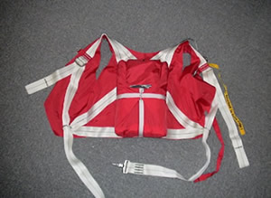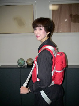 リュックサックのように背負って、3箇所を留め、紐を引いてしっかり固定させ、ロープの端をベランダの手すりに結び付けて、そして、飛ぶだけ。