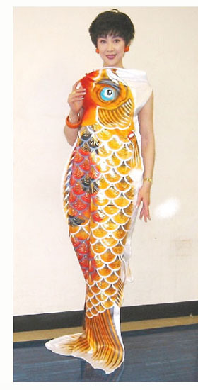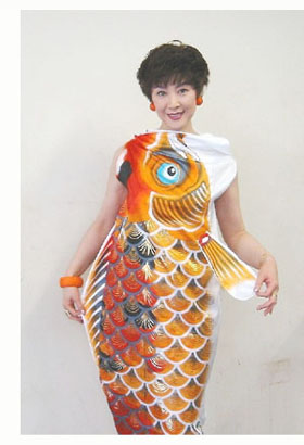 歩きやすいように、しっぽの脇を開いて、スリットにし、腕を出すところ2箇所、開いてあるだけで、空を泳いでいる鯉のぼり、ほとんどそのまんま。