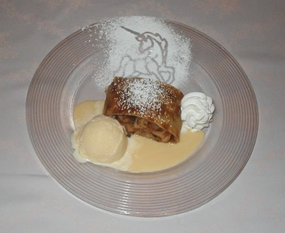 バニラソースが付きますが、それだと甘くなりすぎるので、私はむしろ、バニラアイスクリームとシュラークザーネ(ホイップクリーム)を添えるのが、好きですね。