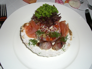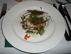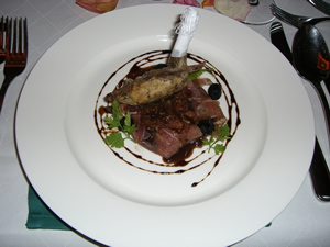 前菜は、セラノ・ハムとウズラのウェハース、イチジクのサラダのバルサミコ・チョコレート・ソース。