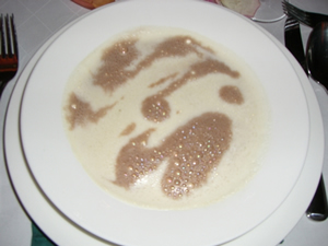 まず付き出しは、デミタス・カップに入ったシュパーゲル(白いアスパラガス)のクリームスープ。