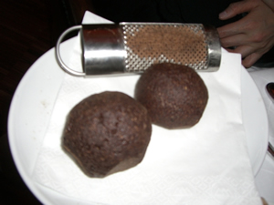 ギャルソンが、ソフトボール大のトリュフを2つ運んできたと思ったら、それは、カカオとペッパー、カカオと唐辛子のお団子で、トリュフと同じように削って、お料理にアクセントとしてかけてくれました!
