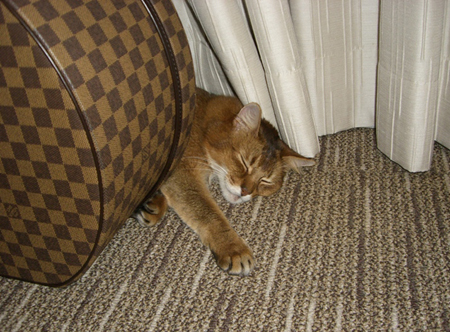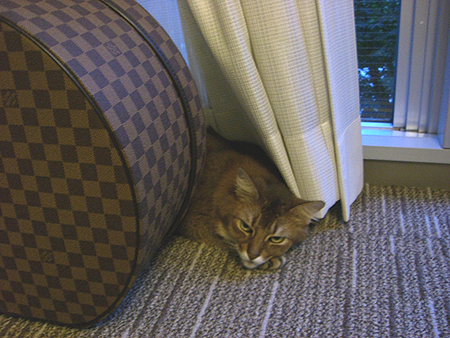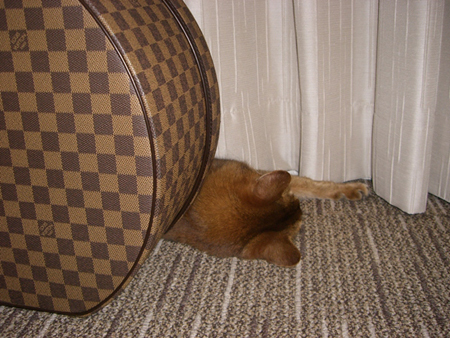 私が新しい帽子ケースを買ってきたら、マフィンは興味津々で、匂いを嗅いだり、回りをうろうろしたり、しょっちゅうバッグのすぐそばでくつろいでいました。
