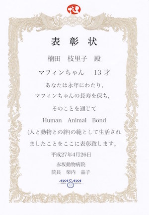 マフィンが13歳になったご褒美に、赤坂動物病院から「表彰状」をいただいたのですよ!!
