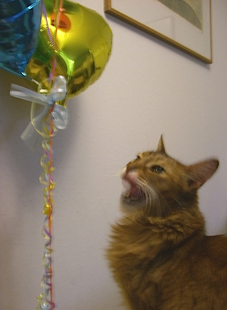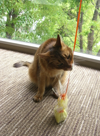 ゆらゆら揺れるバルーンを突っついたり、重りを包んだセロファンにじゃれたり、くるくる巻いたリボンに飛びかかったり・・・普通のネコのおもちゃより、何倍も面白いみたいです。