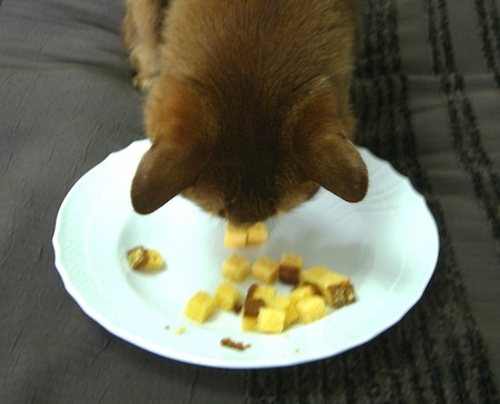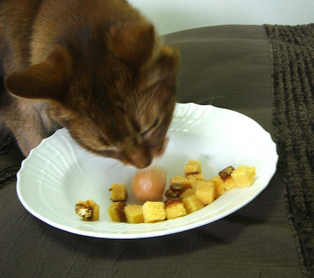 マフィンは普通のカステラにはたいして興味を示さないのですが、この高価な烏骨鶏のカステラは、大喜びでばくばく食べるのです。