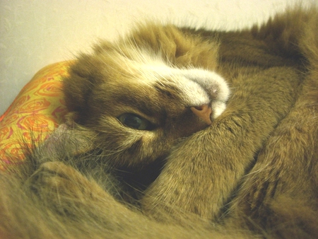 シニア猫の宿命で、初期の腎臓病を患ってはいますが、食欲もりもり、元気いっぱいで飛び跳ねていますよ。
