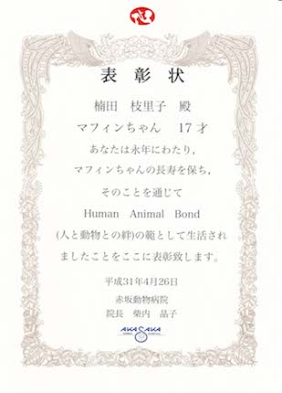 今年も動物病院から、17歳の表彰状をいただきました。