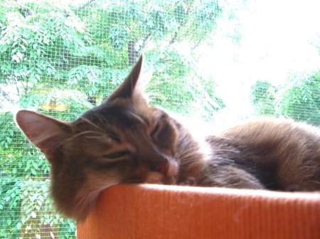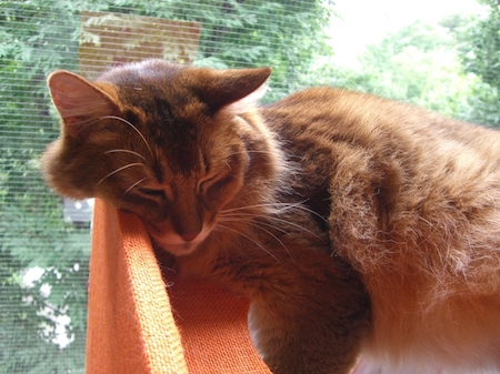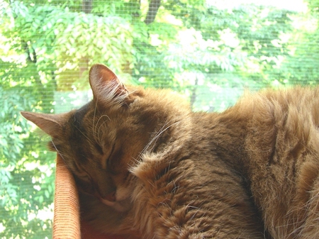やがて足元に移動して、マフィンが寄りかかって眠り始め、私も安心してうとうとしていると、またすぐ胸の上に、ドカン。