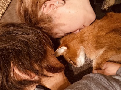 あらし君は、クッションに横になったまま、愛おしそうに抱きかかえられていました。