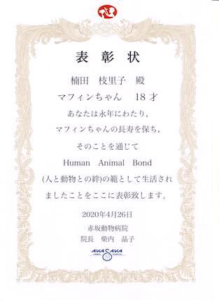 毎年、お誕生日が過ぎると、マフィンは赤坂動物病院で猫ドックに入り、長寿の表彰状を嬉しくいただいてきます。