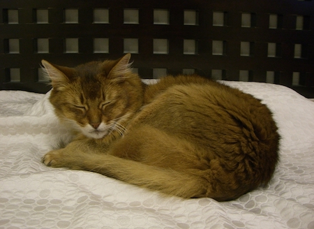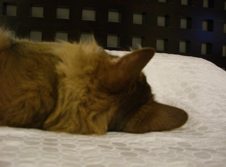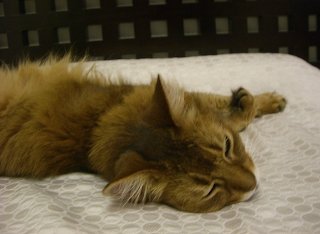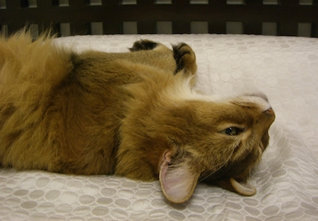 いつものように、マフィンが私の枕のすぐ脇にゴロンと寝転び、私が全身マッサージしてあげていたときのこと。