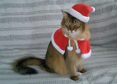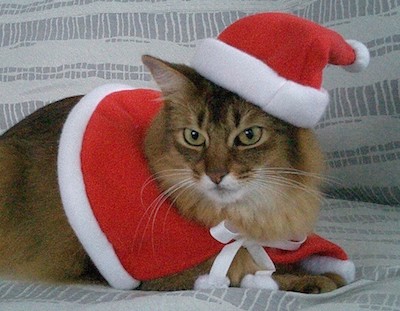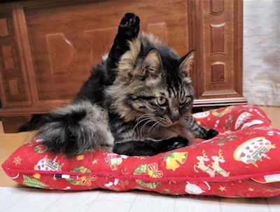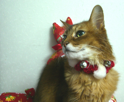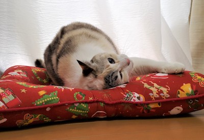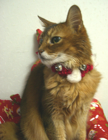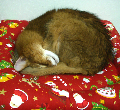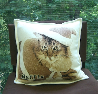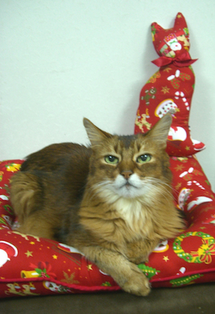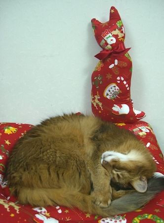 実は、マフィンが亡くなってまもなく、ご長寿ソマリ、佐藤ルディちゃんの直子ママと由紀子おねえさんから、マフィン・クッションを贈っていただき、大感激したのですが、これもサンタ・マフィンがモデルになっていました。
