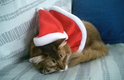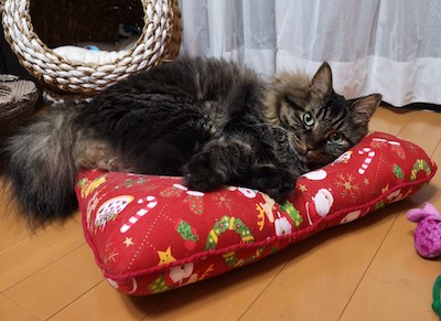 私が世界の国々で見つけてきた、小さなクリスマス・ツリーをあちこちに飾り、出入り口にサンタさんのドアストッパーを置き、1年に1ヵ月だけ登場するクリスマス柄のねむねむを特等席にセッティングし、マフィンはサンタさんの赤い帽子とマント姿で、かわいいったらありません。