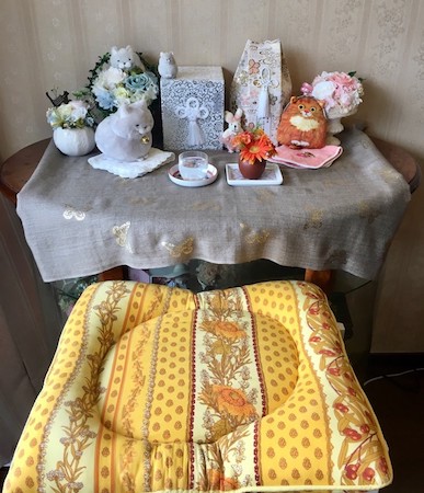 マフィンの形見の黄色いねむねむを受け取ってくださった笠原家では、まずチャビくんにお供えしてくれたそうです。