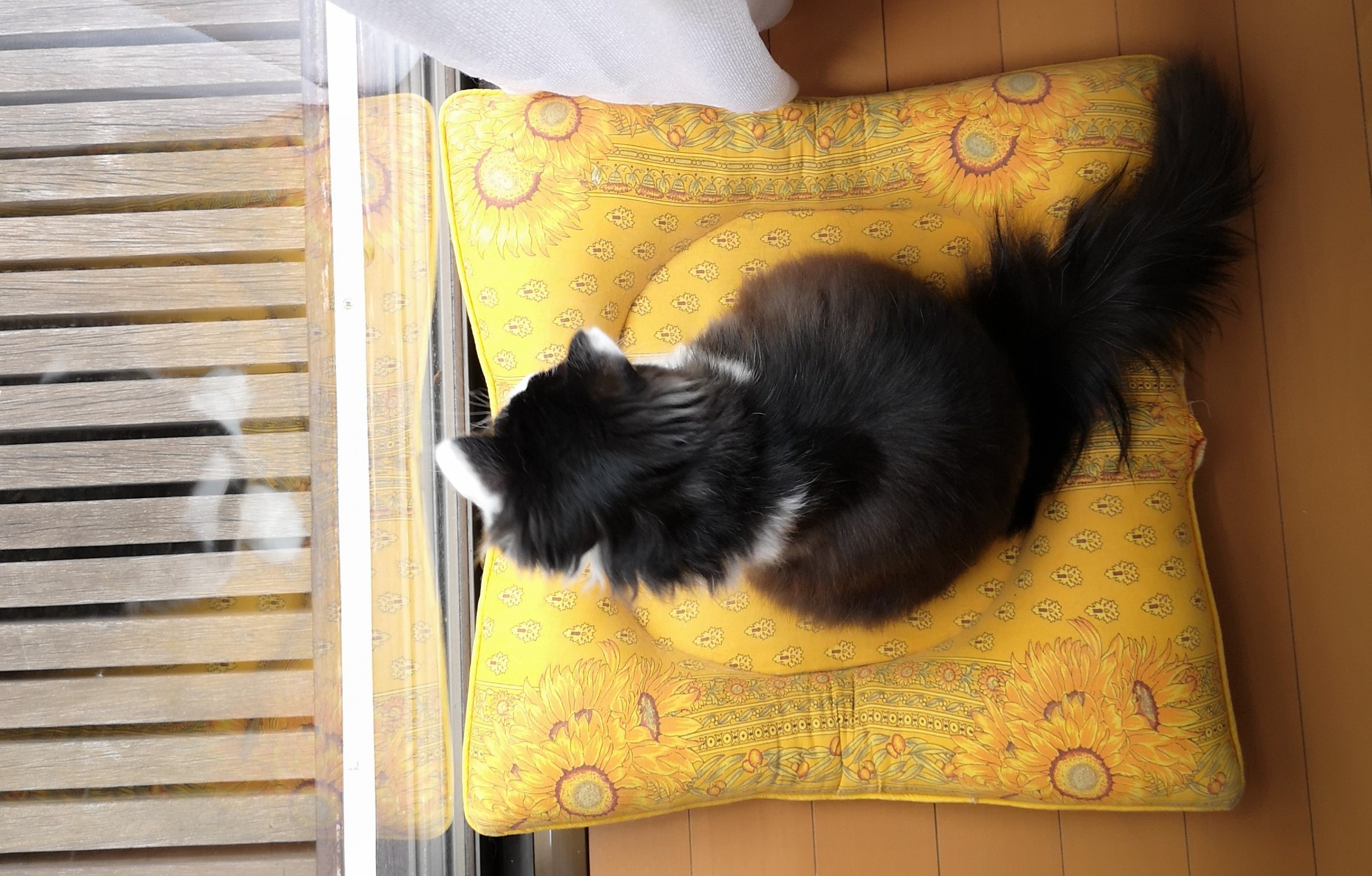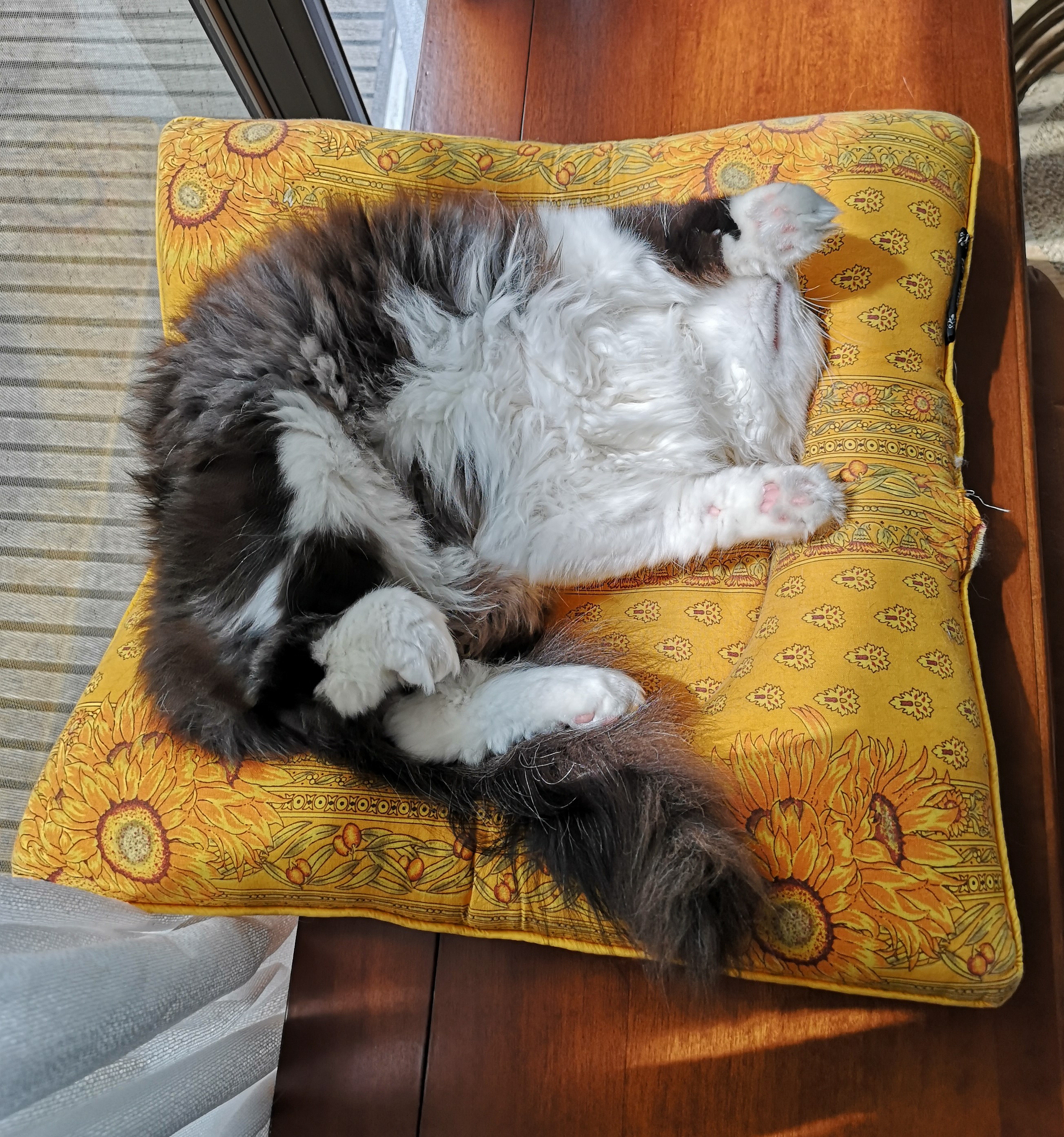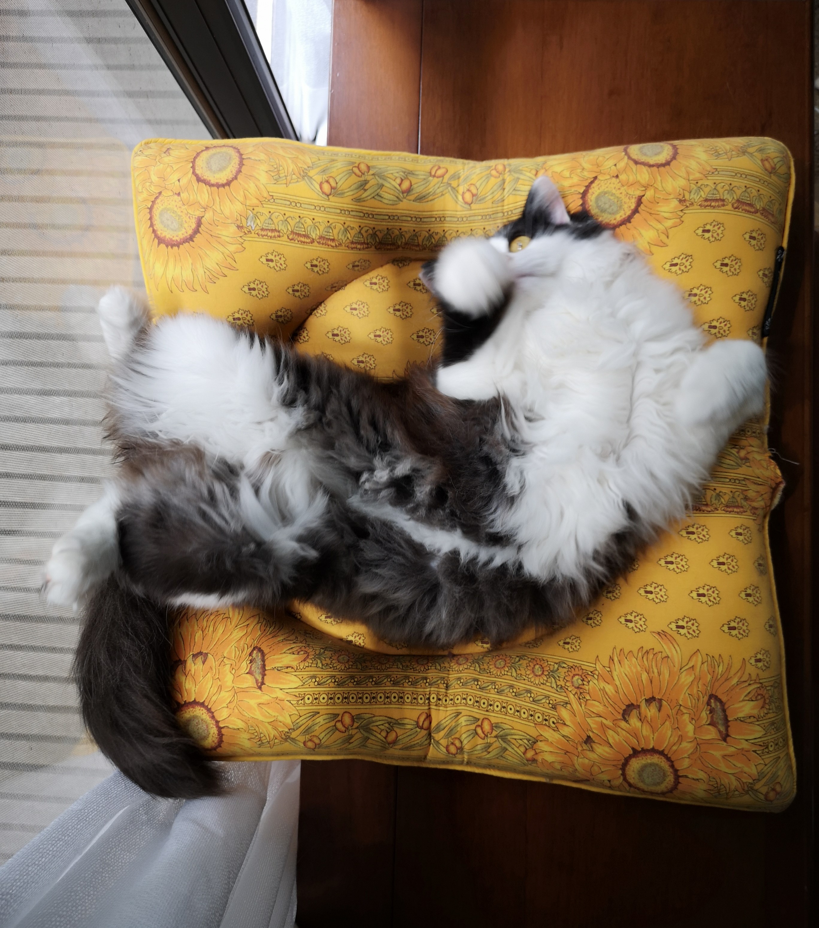 毎年7月、マフィンはいつも、黄色いひまわり柄のねむねむで、くつろいでいたものです。
