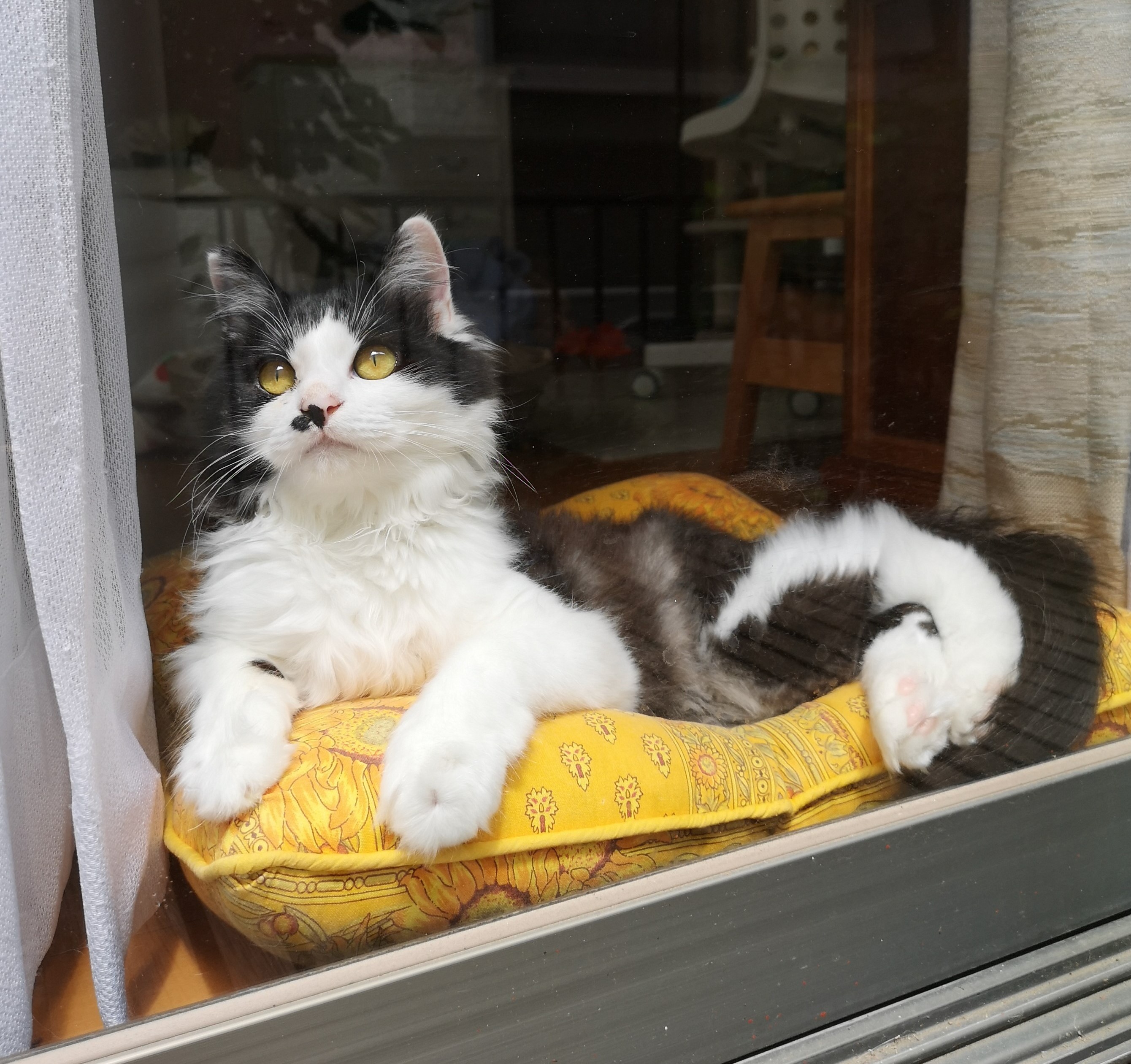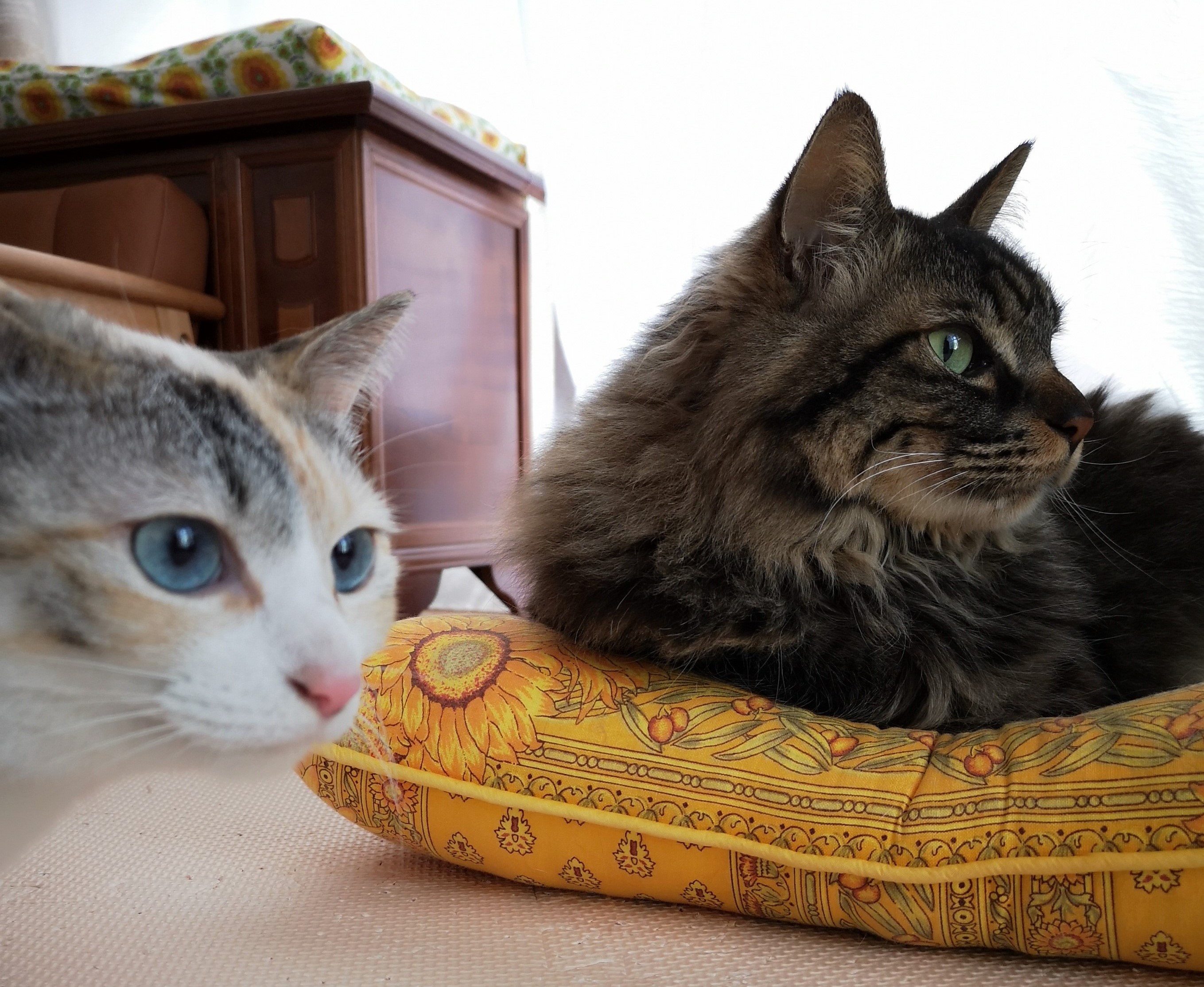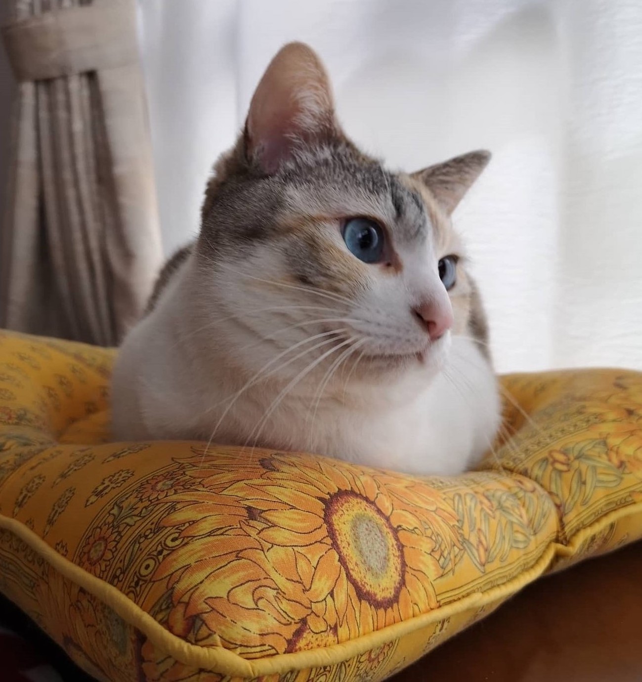 毎年7月、マフィンはいつも、黄色いひまわり柄のねむねむで、くつろいでいたものです。