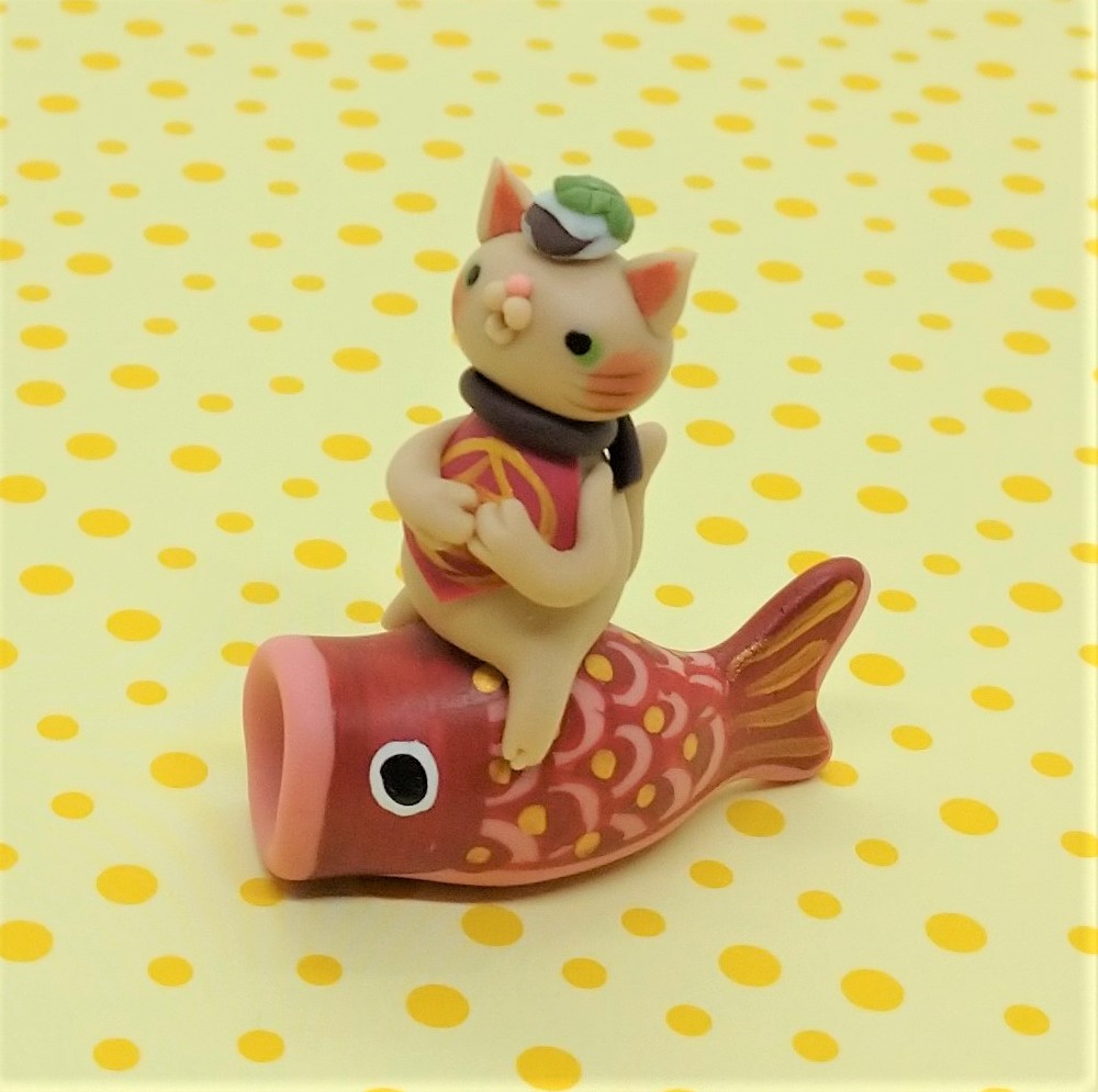 赤い鯉のぼりにまたがり、金太郎さんをつけた、小さな猫(ちょっとブタっぽい?笑)のマスコットです。