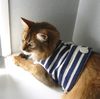 青と白のボーダーのシャツは、不器用な私が、マフィンのために手作りしたもの!!