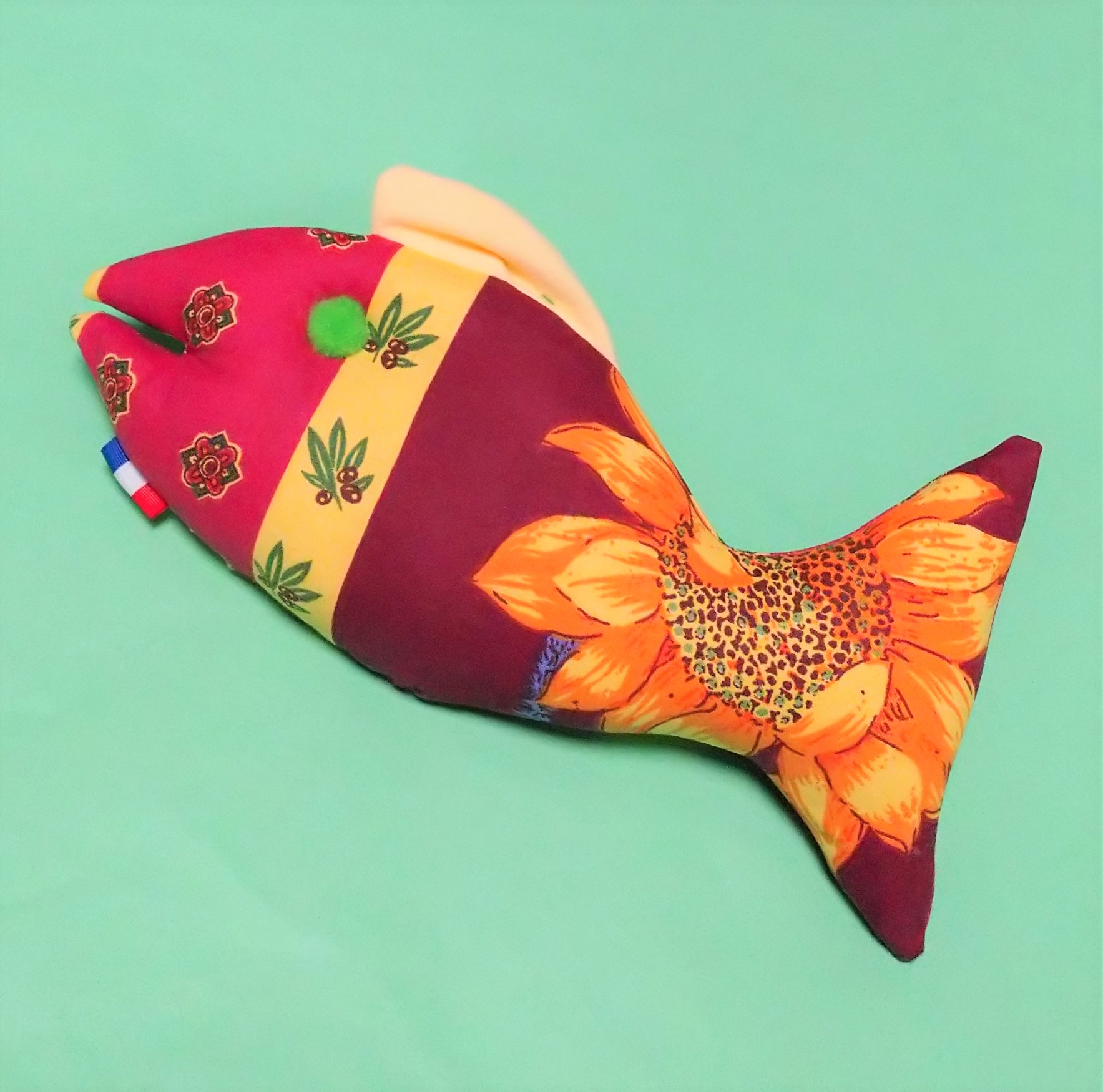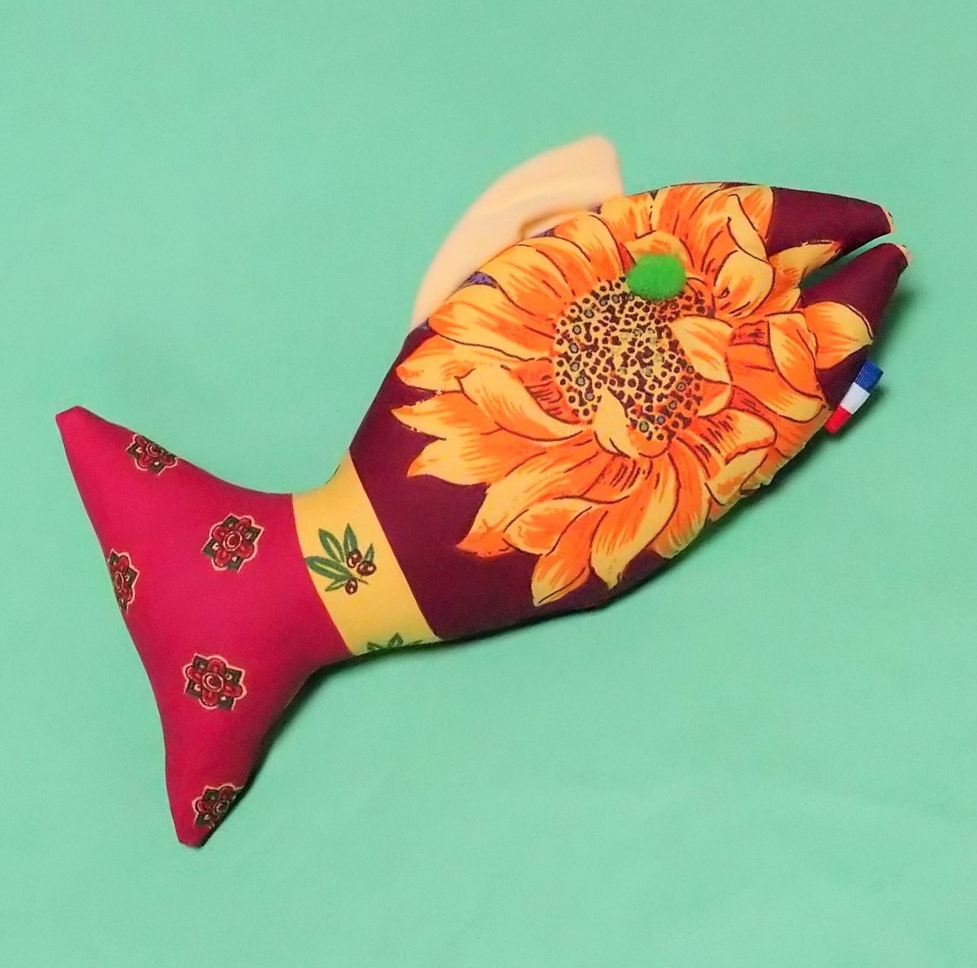 黄色いひまわり柄が大好きで、ひまわりの咲く盛夏に旅立ったマフィンのために、今回この布を探し出し、ポワソンを作ってくださったのですね。