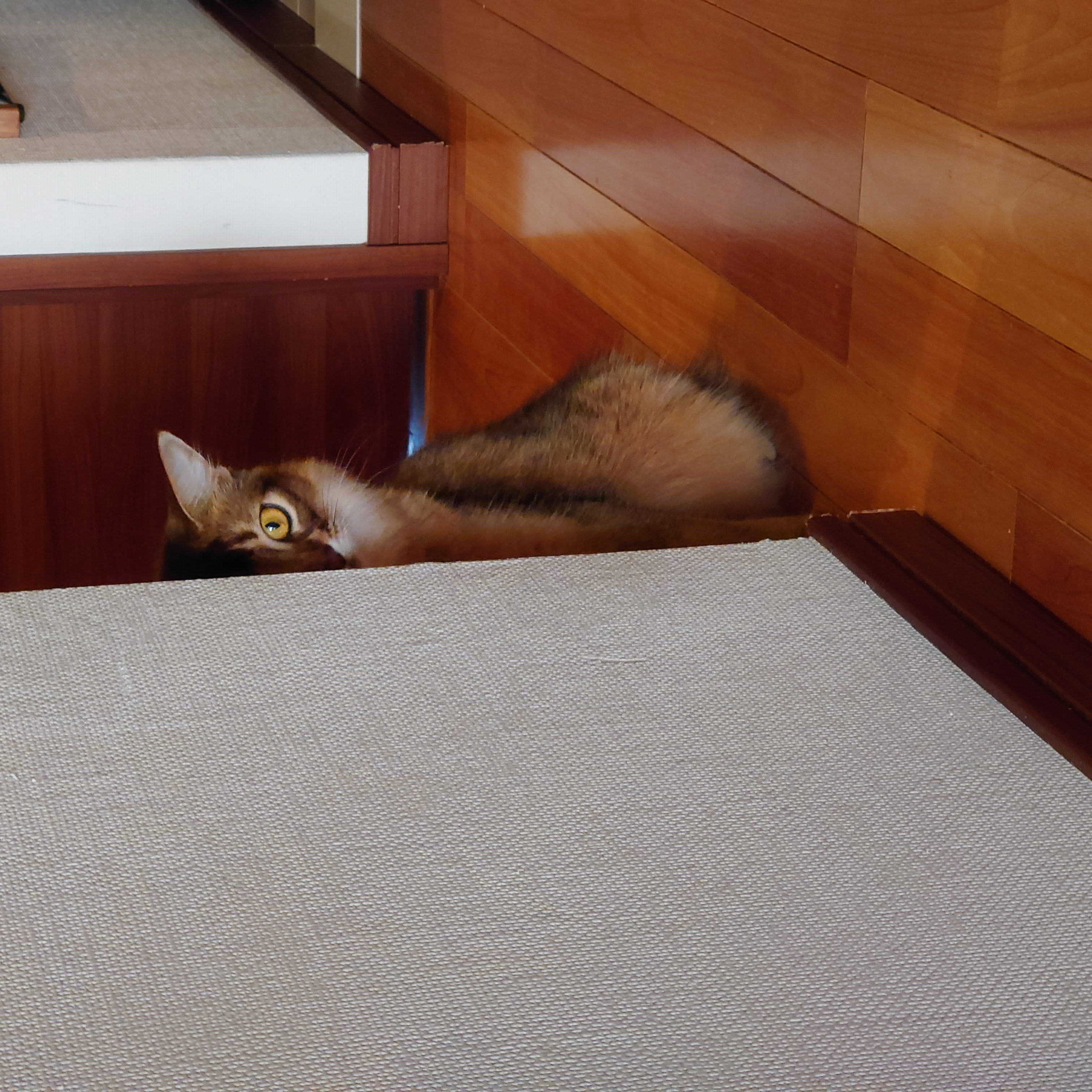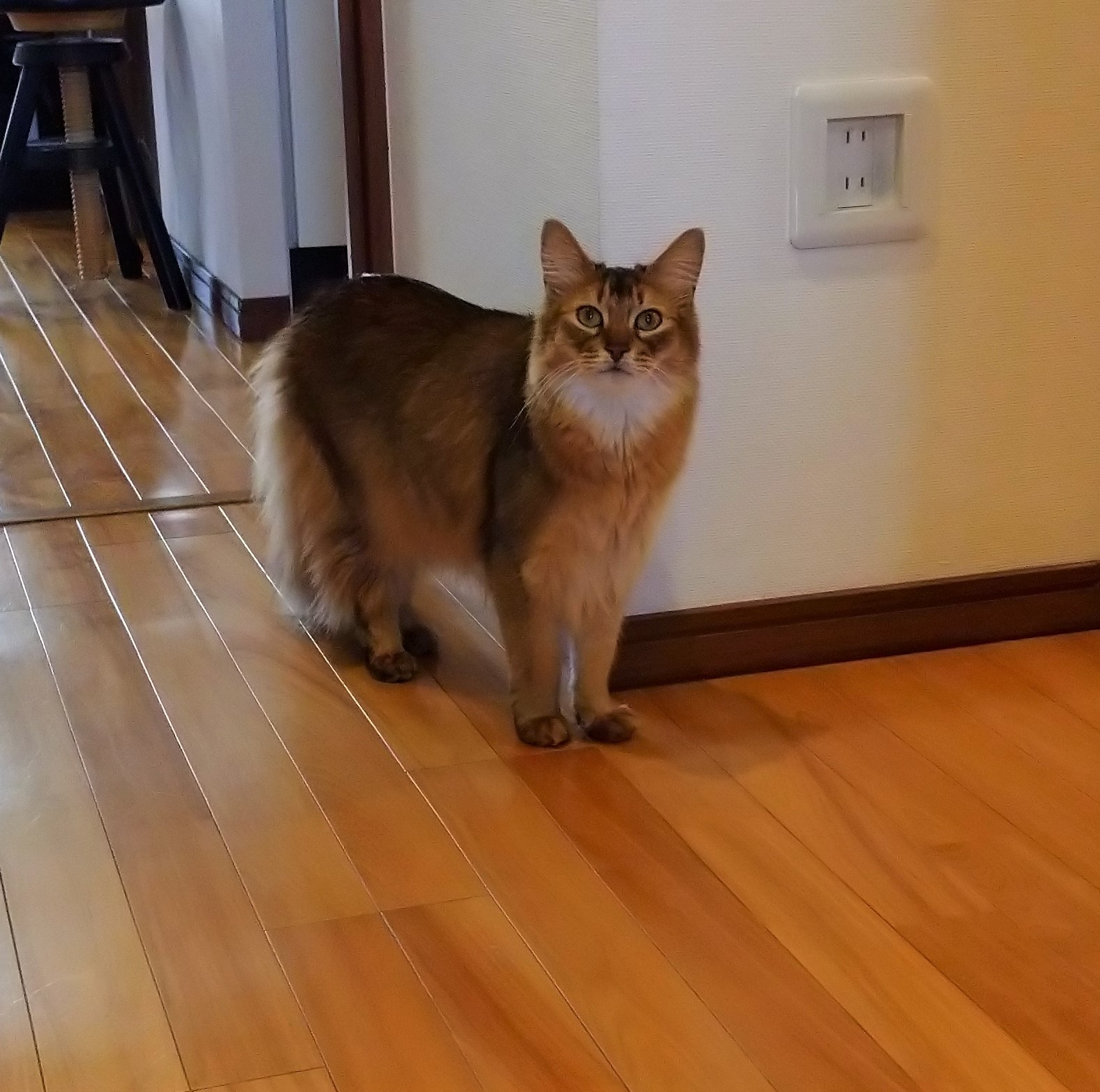 あるとき、ふと視線を感じて、振り向くと、戻ってきたピノちゃんが、廊下の端の角から、楽しそうに遊んでいる私たちを、羨ましそうに眺めているではありませんか。