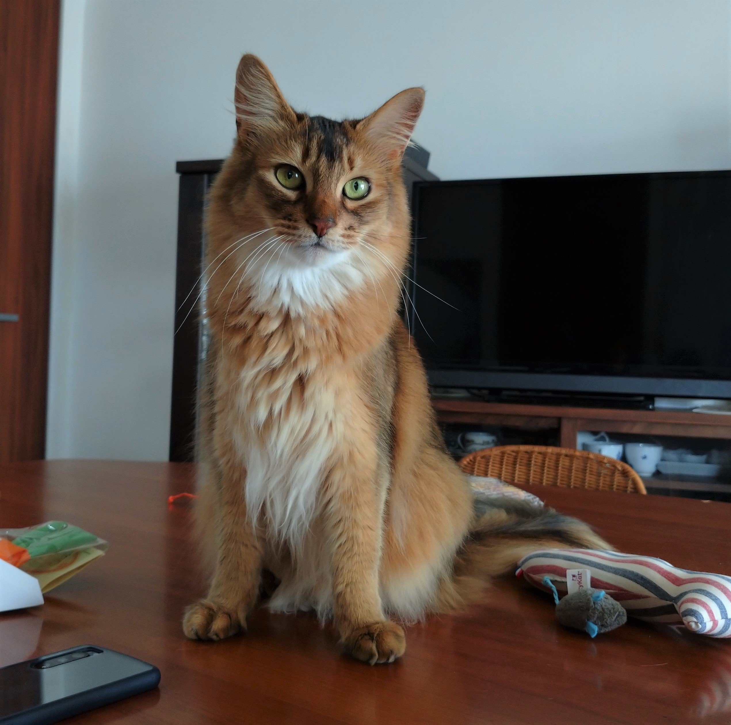 とびママの志乃さんが、リビングへと案内してくれると、とびちゃんは目の前のテーブルに飛び上がり、まっすぐ私を見つめました。