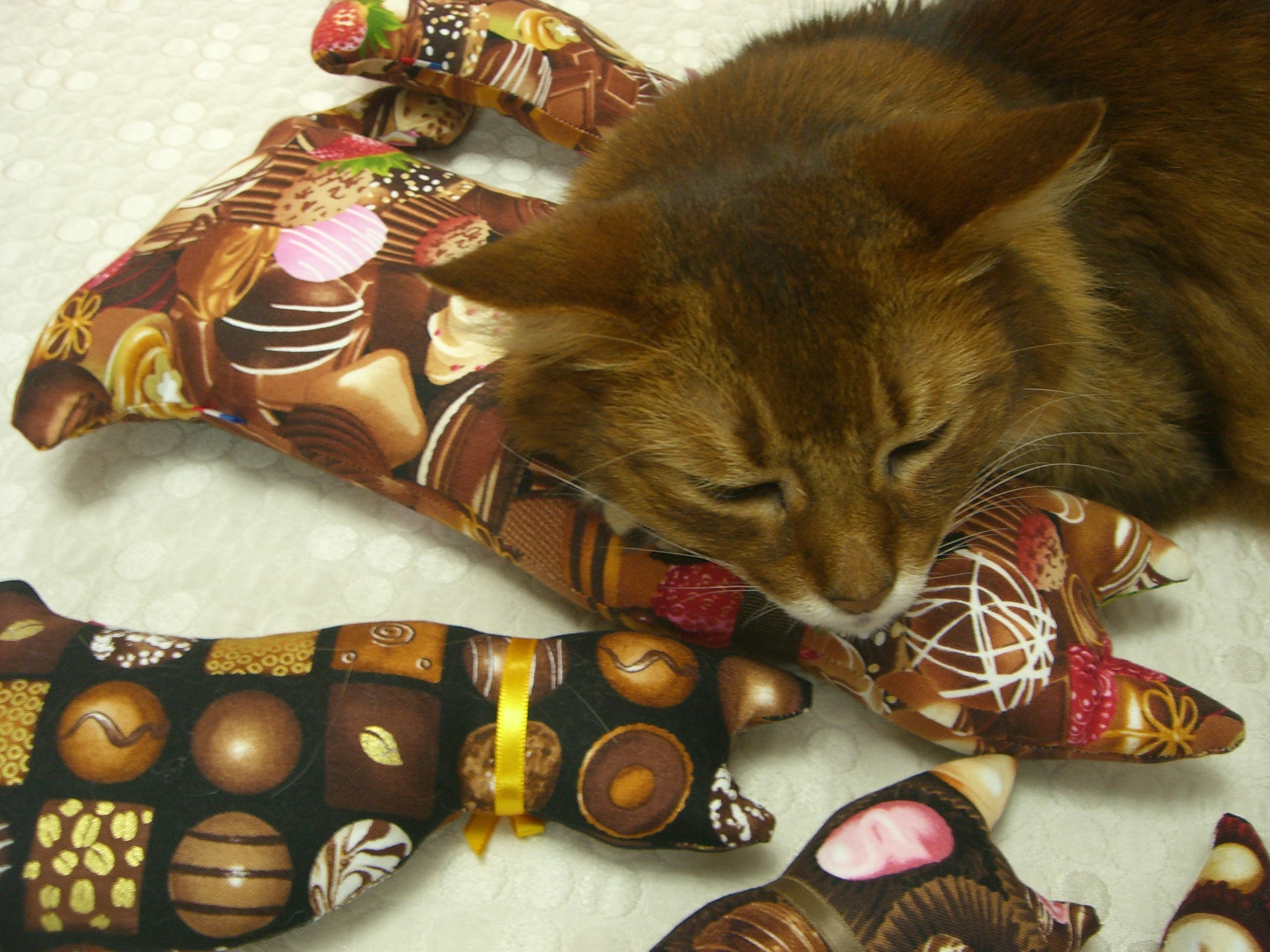猫は本物のチョコは食べられないから、またたび入りのチョコ柄ミネットさんで、大喜びで遊んでいました。