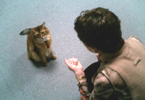何度か繰り返すと、ネコは、立ったポーズからお尻を下げて座ると誉められ、おいしいビスケットがもらえる、ということを覚えるようになります。