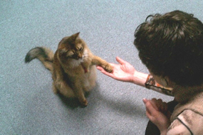 これを繰り返すと、やがてネコは、「おすわり」をした後、左手を上げてママの右手に乗っけると、ビスケットがもらえる、ってわかるようになるんです。