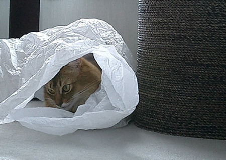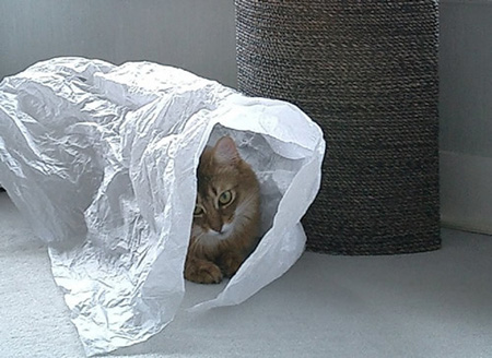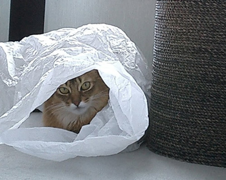 だって、服を包んである、あのシャラシャラいう大きな紙が、格好の遊び場になるからなんです。