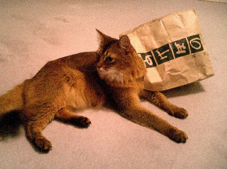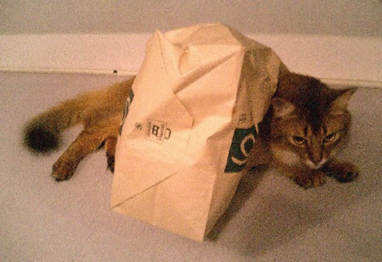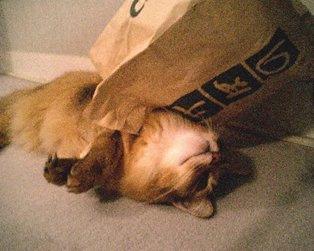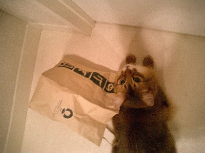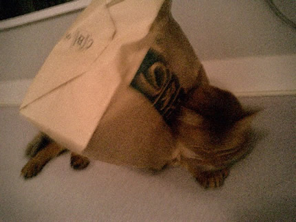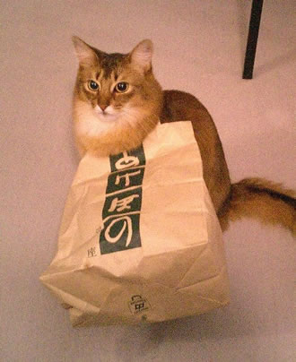いつものように、マフィンと追いかけっこをしている途中で、マフィンが和菓子屋さんの紙袋のなかに逃げこみました。