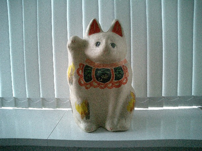 さて、ネコ好きの私の部屋には、大小さまざまな招き猫がいっぱい。