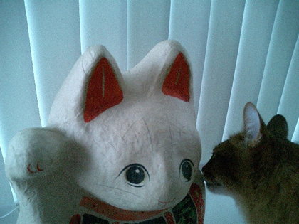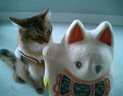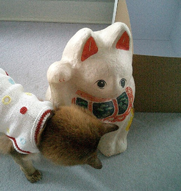 白いのや黒いの、陶器のや紙製の、子ネコをおぶったお母さん招き猫など、すでに17ものネコが福や友を招いてくれていますが、