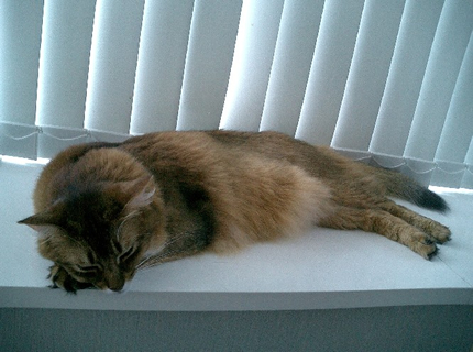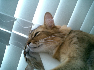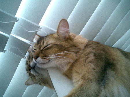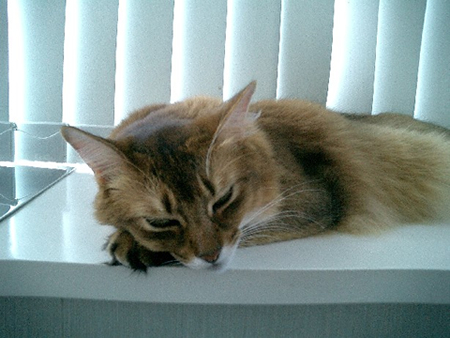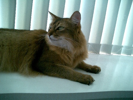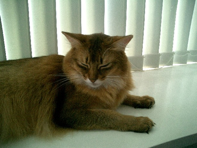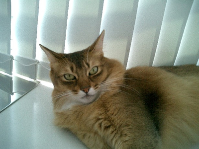 ふとしたときに見せるあどけない眼差しは、チビちゃんだったころの面影を残していますが、今では体つきもしっかりして、長い毛を金色にきらめかせてタワーの上に堂々寝そべっているときには、すっかり、りりしい大人の表情です。