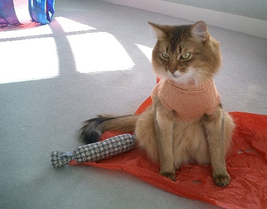 「マフィン、ほら、また新しいおもちゃをいただいたよ〜」