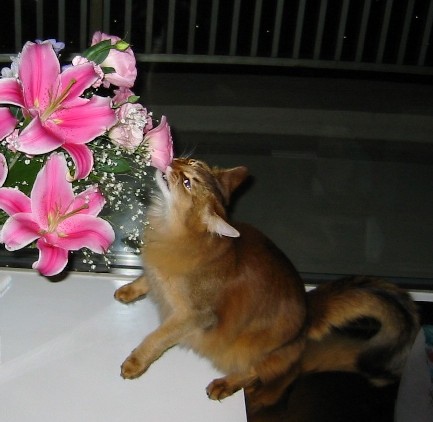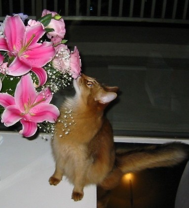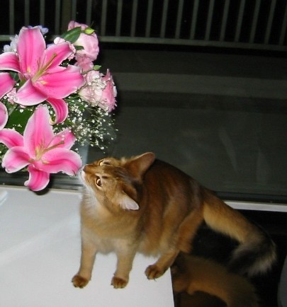 窓際のガラスの花びんに花を入れると、すぐさま近づいて、花びらをペロペロ、葉っぱをクンクン。